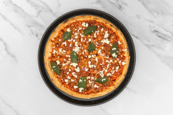 White sauce, braised lamb, roasted pine nuts, cherry tomato, mozzarella, crumbled feta, roquette, and garlic swirl