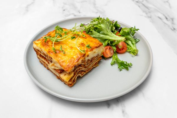 Bolognese, tomato, garlic, fresh basil, béchamel sauce, Parmesan, and mozzarella