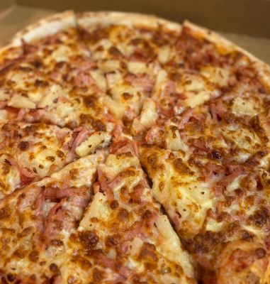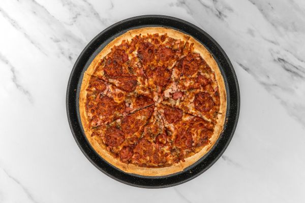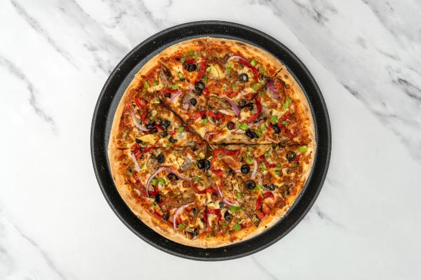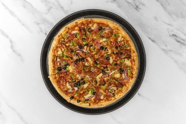 Napoletana sauce, ham, pepperoni, cabanossi, olives, mushroom, red onion, green capsicum, and pineapple