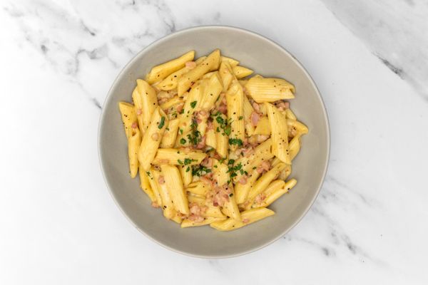White wine, cream, bacon, and Parmesan. Served with your selection of pasta spaghetti, penne, or ravioli