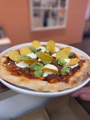 Napoletana, taco beef, chilli, red peppers, jalapeños, corn, red onion, mozzarella, avocado, and sour cream